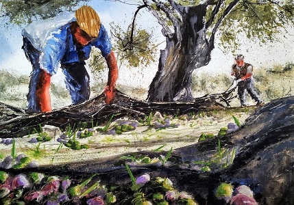 Acualera sobre papel de 300 gr Se vende sin marco. 70 cm x 48 cm "El Olivo es el patrón", forma parte de una serie de 2 cuadros relacionados con el campo y el abandono del mismo. El otro cuadro de la serie se llama "Abandono rural". Lo mas notable, la luminosidad y el gran cormatismo de esta obra. Se puede apreciar al olivo erguido ante los dos hombres casí como su patrón, decidiendo cuando se debe de recoger la cosecha, al igual que decide el resto de calendarios.