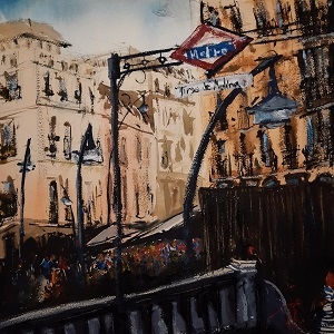 Acuarela sobre papel (reciclado). NO DISPONIBLE 39 cm x 39 cm Como podrás observar después del Metro de Chueca, traemos la parada del Metro de Madrid en Tirso de Molina, en el castizo barrio de La Latina. Es un cuadro decorativo de tema urbanita, si te gusta Madrid y sus rincones esta es tú obra. Fue inaugurada en 1921 bajo el nombre de Progreso. Hasta 1834 en este lugar se encontraba el Convento de la Merced. En 1600 ingresa en el Fray Gabriel Téllez, dramaturgo que firmaba sus obras con el seudónimo de Tirso de Molina. Por esta razón en 1939 se rebautiza con el nombre del escritor, y su estatua preside la Plaza. La obra tiene un carácter muy urbano. Tenemos un formato cuadrado, el cual nos obliga a realizar un ejercicio extra de composición. Se ha centrado el foco de atención en la propia parada de Metro y una de esas farolas tan características como segundo elemento de importancia. El tercio inferior se ha oscurecido para poder levantar hacia el espectador el fondo de la obra, la cual a su vez centra la atención en Tirso de Molina, la parada de Metro. En cuanto al fondo se aprecia el contraste de valor para simular esa profundidad. Como viene siendo habitual se omiten gran parte de los destalles insinuando formas y estructuras. Es una obra reciclada, al igual que los folios, se puede pintar por ambos lados, siempre que no se empleen técnicas agresivas, este es uno de esos casos.
